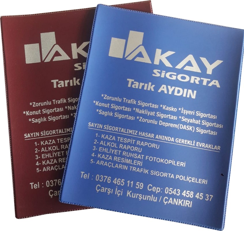 Firmanızın logosu ile size özel baskılı ürünler üretiyoruz. Bunları firmanızın promosyonu amacı ile satış sırasında eşantiyon ürün, promosyon vb şekillerde kullanıcılara ulaştırarak firmanızın adının kalıcı olmasını sağlıyorsunuz. Trafikte kullanılan araçlarda bulunması zorunlu/gerekli bir çok resmi evrak vardır. Ruhsat, trafik poliçesi gibi bu evrakları düzgün bir şekilde muhafaza etmek amacı ile tüm araç sahipleri buna ihtiyaç duyar. Araç satışı sırasında veya trafik-kasko poliçesi düzenleme sırasında araç sahiplerine verilen ruhsat kapları yıllarca sürekli el altında kullanılmakta olup en iyi reklam araçları haline gelmektedir. Araç Satış Bayileri, Sigorta Şirketleri kendilerine özel baskılı, logolu ruhsat/poliçe kapları hazırlatarak reklamlarına büyük katkı sağlayabilir.